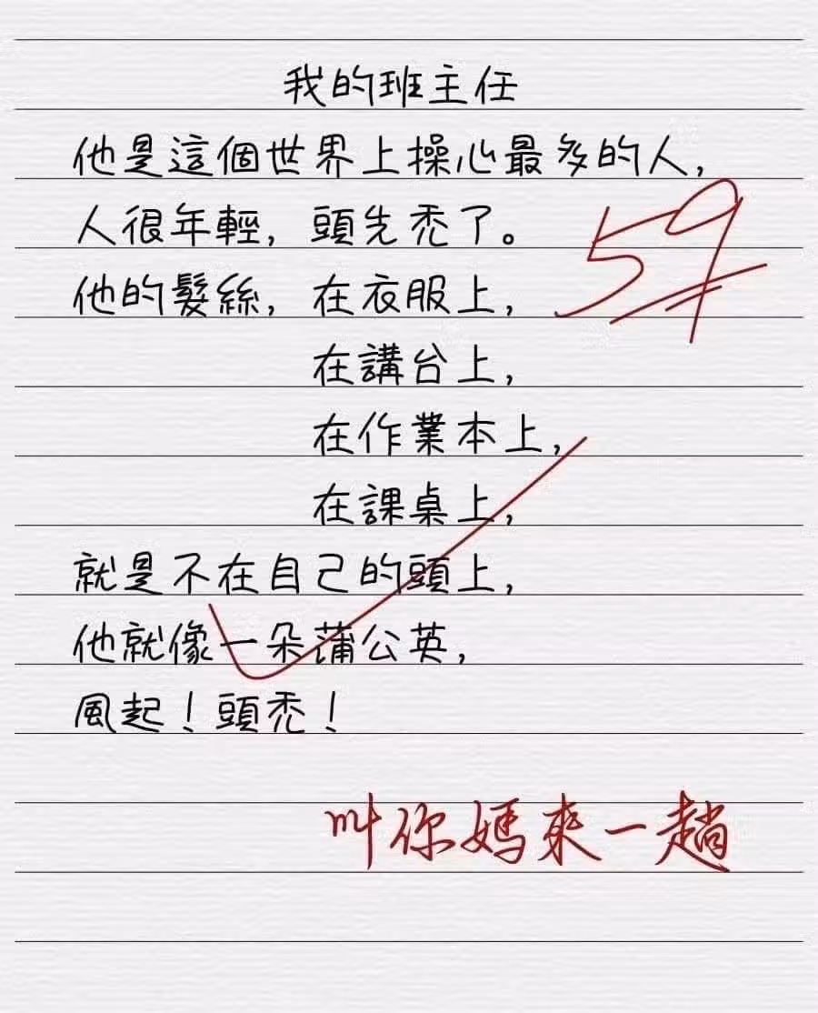 不得不說,這位學生對自己老師觀察的真仔細,而且還說 「他的發絲在衣服上、在講台上、在作業本上、在課桌上,就是不在自己的頭上,他就像一朵蒲公英,風起,頭禿」!