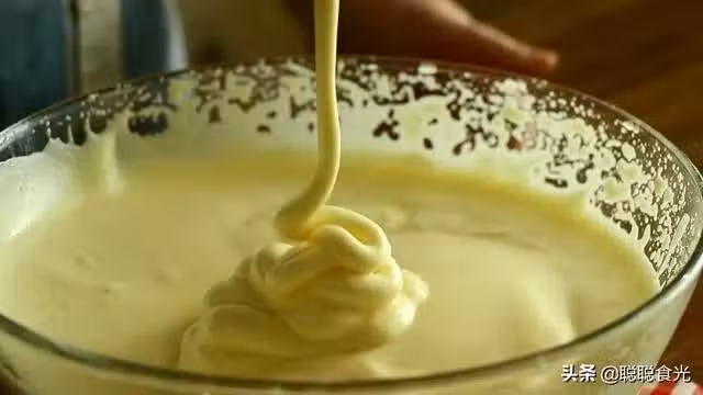 步驟四:打發到更加濃稠的時候,再提起來看一下,雞蛋糊流到盆中,能停留三秒鐘左右,這樣就是快打好了,但是狀態還是不夠,接著高速打發,打發到紋路更加清晰,提起來滴落到盆中能停留8秒鐘以上,雞蛋就打發好了。