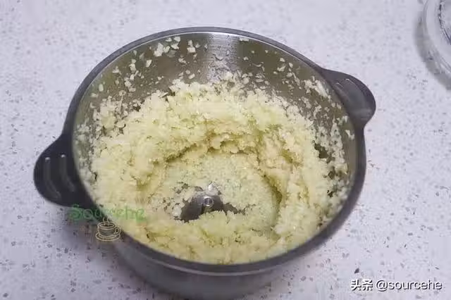 步驟4:攪碎好的蒜泥倒入一大盤子,放鹽,少許花生油攪拌均勻,裝入密封玻璃罐,蓋子蓋子,放入陰涼的地方就可以,開蓋之後需要放入冰箱冷藏。其中鹽要放入鍋,炒干,放涼,這個要提前準備好。