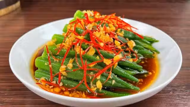 食材:秋葵、蒜、小米辣、油、生抽、醋、蚝油、糖