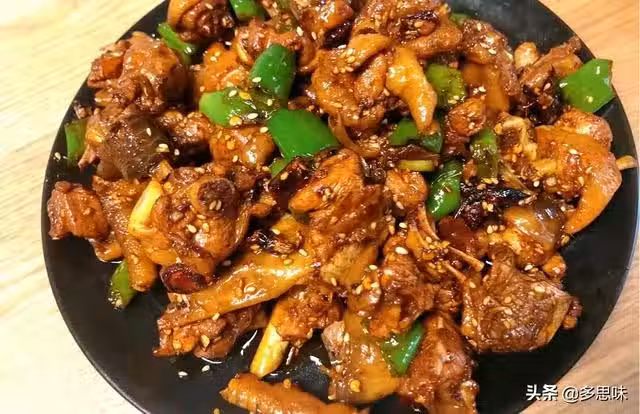 將雞肉洗乾淨 剁成塊 濾干水分,鍋中倒多一點的油 小火 放入八角 爆香~,接著放入香葉 花椒 干辣椒 蔥姜蒜 繼續小火爆香,倒入雞塊 轉大火,持續煸炒大概5-10分鐘(每家灶台火候不一樣),劃重點了‼️直到聽到噼~啪~噼~啪❗️的聲音,轉中火 加入青紅椒/線椒 再加入生抽 老抽 料酒 雞精,老抽主要是為了色澤好看 不用一下放太多,繼續翻炒3-5分鐘左右 加入兩三小勺的白糖,撒入白芝麻,嘗一下鹹淡味道 調整下 不夠咸就再放點生抽,覺得味道可以了就可以出鍋了。