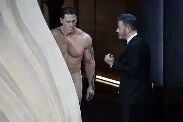 在主持人的「鼓勵」之下,約翰希南僅用頒獎信封遮住重要部位,緩緩側步走到舞台中間,讓現場觀眾陷入沸騰,不斷拍手叫好,他一開口就對觀眾說,「衣服真的太重要了,可能是全世界最重要的東西。」