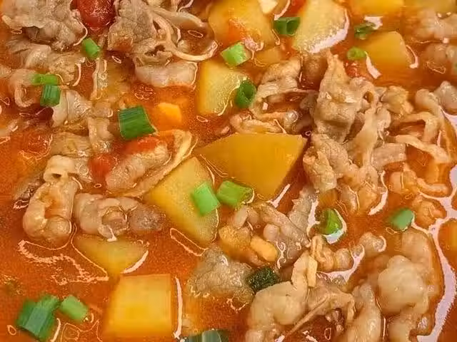 4、土豆煮熟後,放入肥牛和食鹽,翻炒均勻後撒上蔥花點綴即可出鍋裝盤開吃。