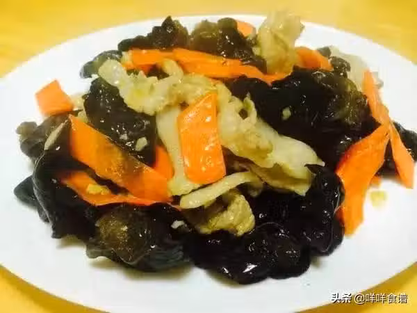 食材:胡蘿蔔,木耳,豬裡脊,生粉,料酒,鹽,耗油,糖,生抽