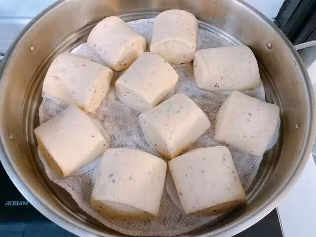 7、冷水上鍋蒸,水開蒸12分鐘左右,關火燜3分鐘左右再出鍋,蓬鬆暄軟還帶有點嚼勁的山藥紅棗饅頭就做好了。