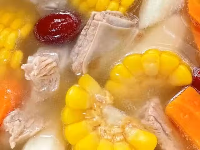 4、時間到,再放入去核紅棗、胡蘿蔔、山藥和玉米,繼續燉煮二十五分鐘左右。