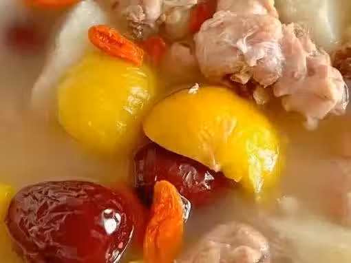 準備食材:山藥,板栗,雞肉,紅棗,枸杞子,薑片。
