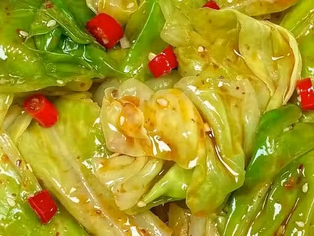 4、把涼拌汁倒入包菜中,攪拌均勻腌制入味即可端上桌開吃。