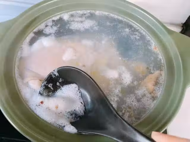 6、燉煮到差不多的時候,用筷子插一下,能輕鬆扎進去說明雞肉也煮熟了,出鍋前可以撇一下表面的浮油,撇乾淨浮油能減少脂肪的含量。
