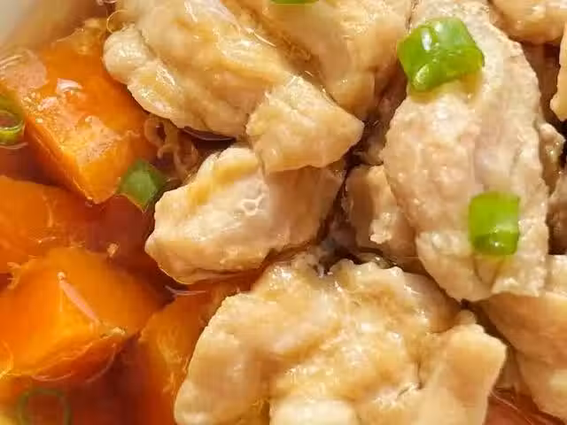 2、胡蘿蔔去皮,洗凈後切成丁,放在蒸盤上,再放入薑片和瘦肉,鋪上蔥段,冷水上鍋蒸二十分鐘。