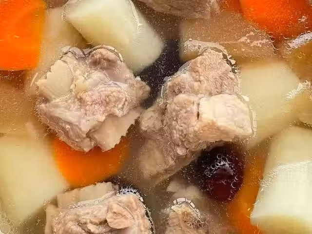 3、將排骨、山藥、胡蘿蔔、薑片和紅棗放入湯鍋中,加入足量的清水,蓋上蓋子燉煮半個小時。