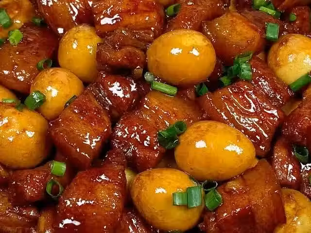 5、接著放入鵪鶉蛋,繼續燜煮二十分鐘。煮好後放入蔥花翻炒幾下即可出鍋裝盤開吃。