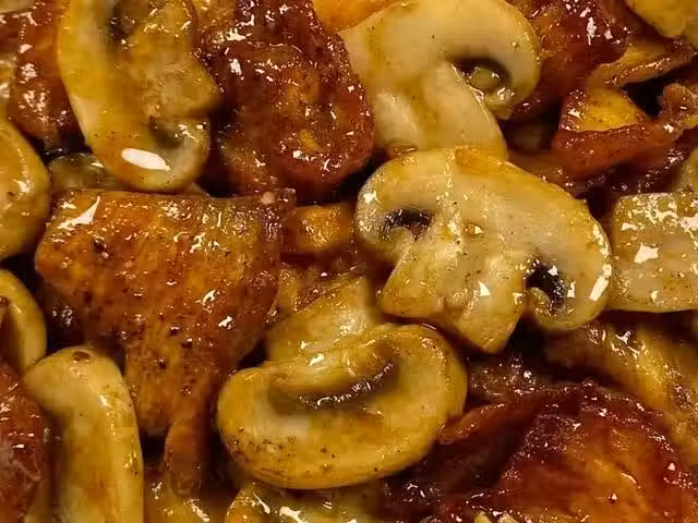 3、鍋中底油,放入蒜末炒香,再放入口蘑翻炒,炒軟後放入雞胸肉翻炒均勻。