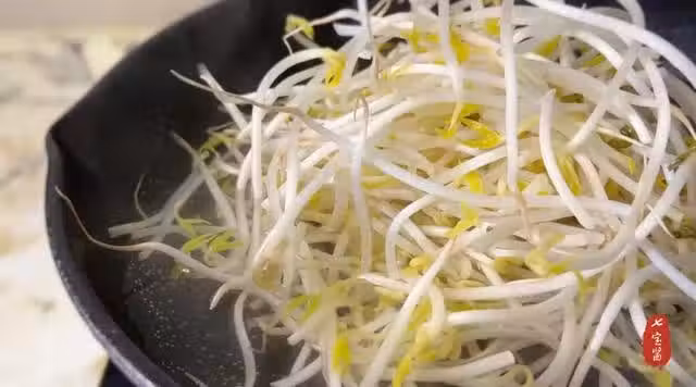2、鍋燒熱後倒入少許的油,放入蔥花爆香,接著倒入焯好的豆芽翻炒。