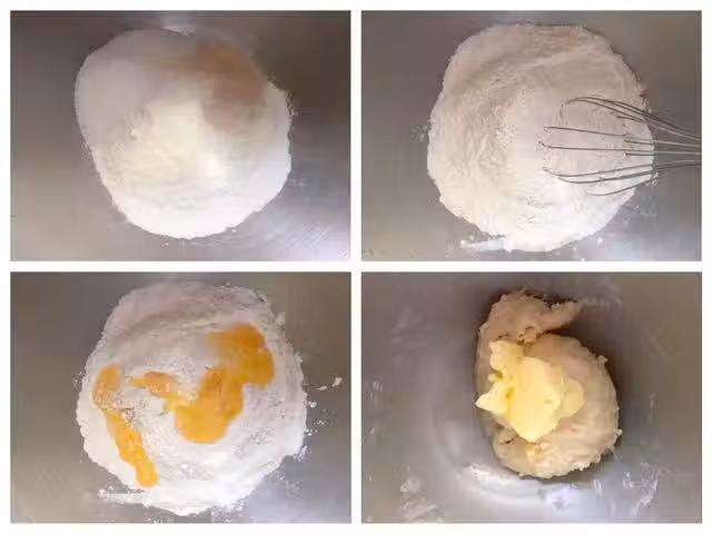 第四步:麵糰揉好之後加入室溫軟化好的黃油,揉至完全擴展階段,也就是揉出手套膜,將揉好麵糰整理好放入容器中蓋上保鮮膜發酵至兩倍大。