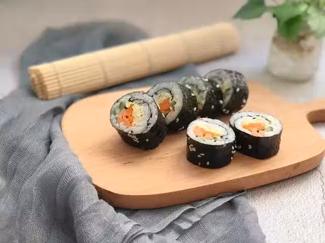 韓國的紫菜包飯在卷的過程中,會將米飯向海苔方向輕輕地用力擠壓,這樣一邊擠壓一邊卷,就能卷出一口可以吃下的紫菜卷,這個大小在食用的時候非常方便。
