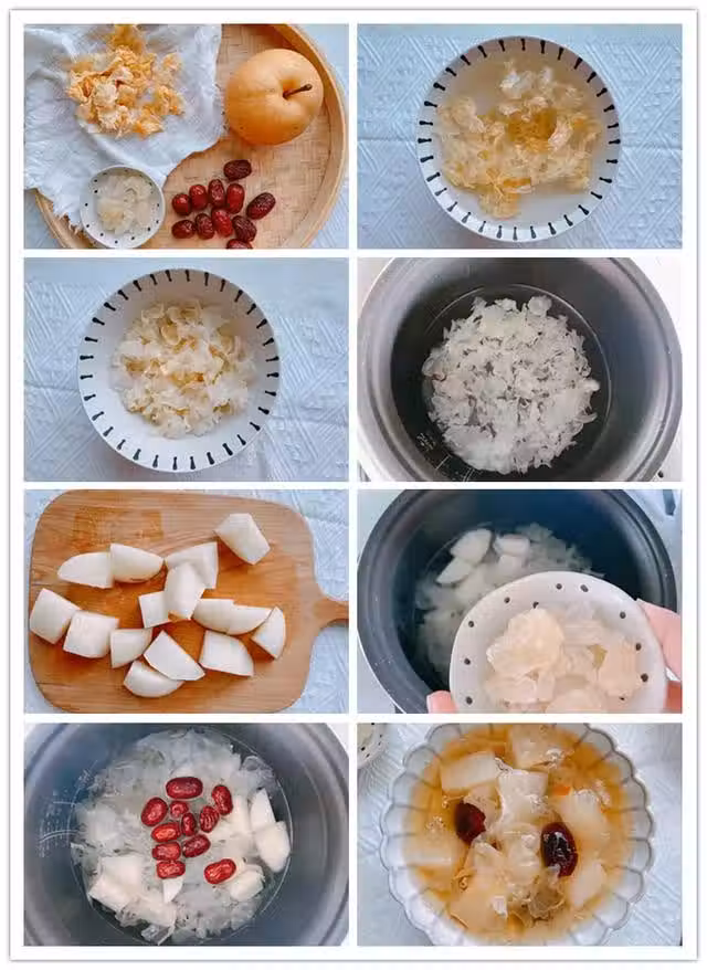 5、時間到,出鍋,好喝的銀耳秋梨湯完成;銀耳軟糯香甜,還有紅棗和梨的香味;
