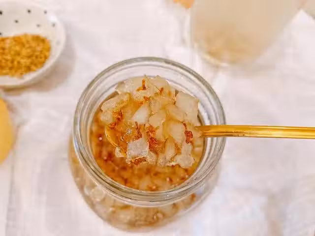 4、把桂花秋梨果醬裝在提前準備好的無水無油的容器中,表面倒入蜂蜜,不僅能讓潤燥效果更好,還能讓保存時間更久;完全放涼之後,蓋上蓋子,放在冰箱冷藏保存,能保存半年;