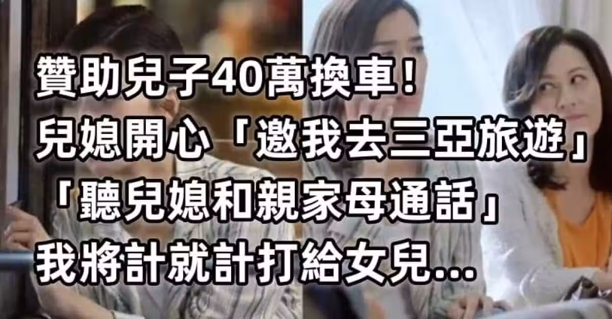 贊助兒子40萬換車!兒媳開心「邀我去三亞旅遊」,「聽兒媳和親家母通話」我將計就計打給女兒…