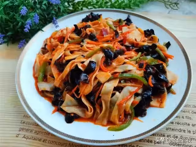 6.下入尖椒絲,胡蘿蔔絲,木耳絲,一起翻炒1-2分鐘。
