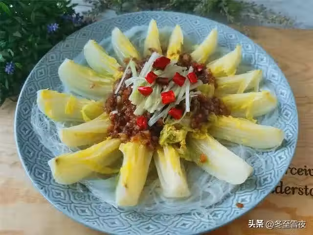 6.把粉絲平鋪在盤內,把娃娃菜轉圈擺在粉絲上。