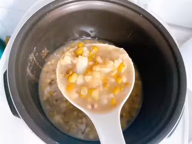 5、燉煮好的綠豆薏仁百合湯裝碗,不管是當點心還是正餐的時候來上一碗,都是不錯的選擇,用電壓力鍋燉出來的綠豆特別綿軟。