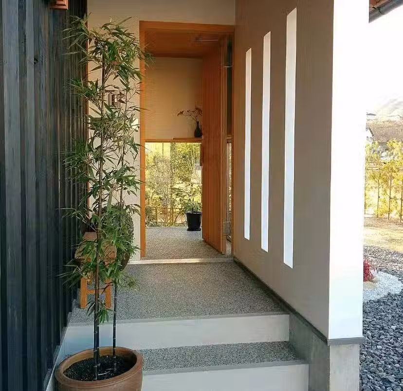 這一場景同樣也被《住所設計》雜志捕捉到,還對房屋後續的情況做了很多報道。 踏上兩個台階才進入入戶門前,為了保證隱私視覺又需通透,不影響採光,屋主專門做了格柵式墻體設計,獨特又有創意。