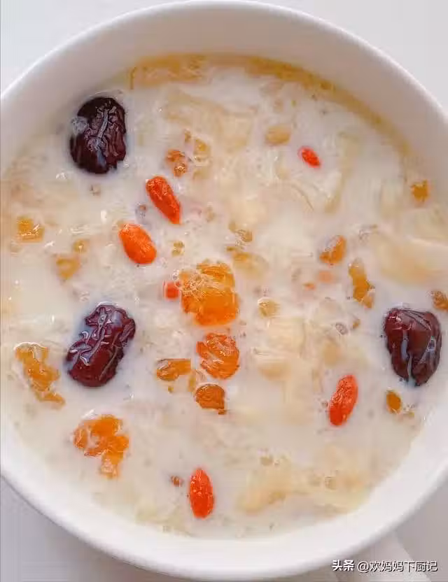 第三步:將泡發好的銀耳 桃膠 皂角米 紅棗加入清水燉煮50分鐘左右,燉煮出膠加入雪燕 枸杞燜煮5分鐘左右加入適量攪拌均勻即可(中途記得攪拌,避免出膠後糊底)