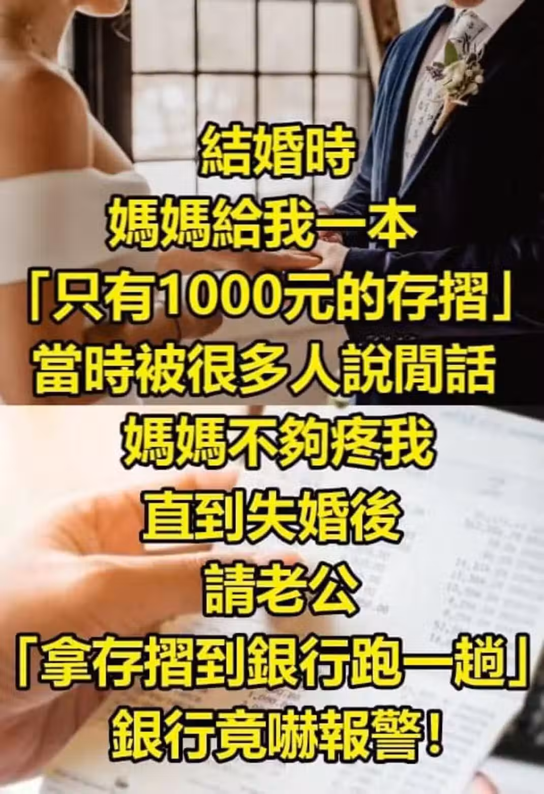 結婚時,媽媽給我一本「只有1000元的存摺」,當時被很多人說閒話,媽媽不夠疼我,直到離婚後,請老公「拿存摺到銀行跑一趟」,銀行竟嚇報警~