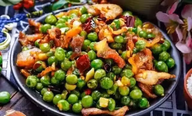 3、鍋里放油,將臘肉煸香後撈出,鍋內留底油下入干椒,煸香後,放放青豆翻炒,同時加入醬油、蚝油,再加入臘肉一同炒香,加鮮湯、加大蒜葉,略燜,之後即可出鍋。