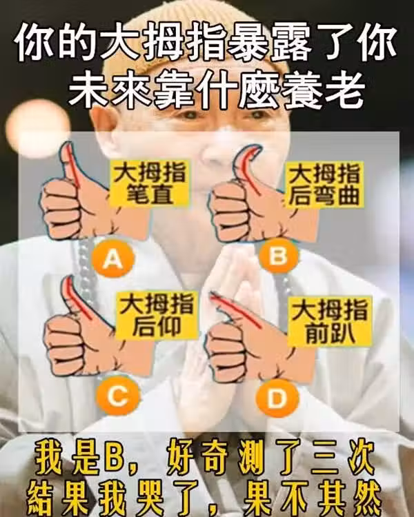 我們不能完全控制自己的生死富貴,只能盡力而爲。你的大拇指暴露了你未來靠什麼養老!太準了!