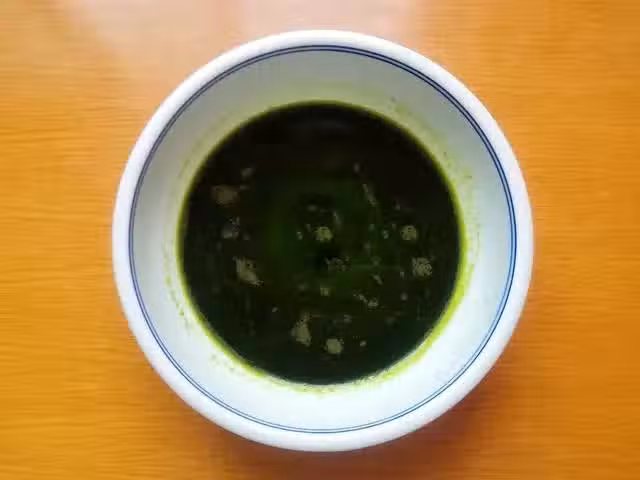 4、然後往菠菜汁碗內加入20克的玉米油,用手動打蛋器,充分乳化均勻。乳化好後,放置待用。此時蒸鍋內,開始燒熱水