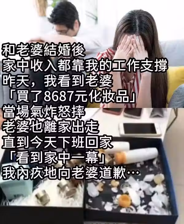和老婆結婚後,家中收入都靠我的工作支撐。昨天,我看到老婆「買了8687元化妝品」,當場氣炸怒摔,老婆也離家出走。直到今天下班回家「看到家中一幕」,我內疚地向老婆道歉…