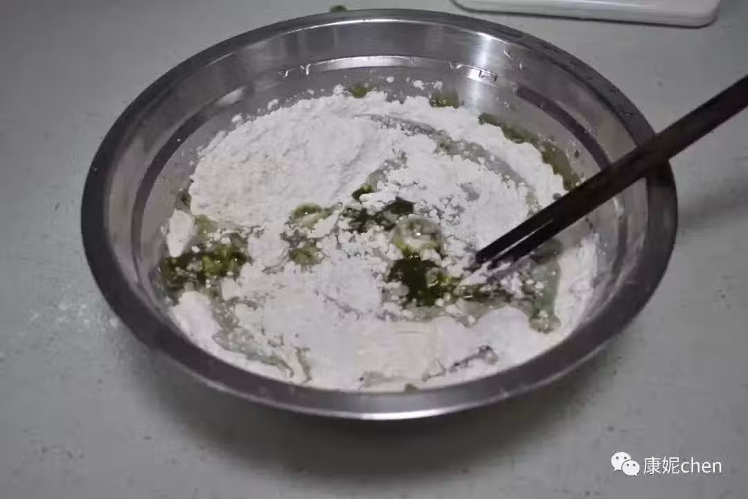 第四步 艾葉汁、中筋麵粉、小麥澱粉攪拌均勻。