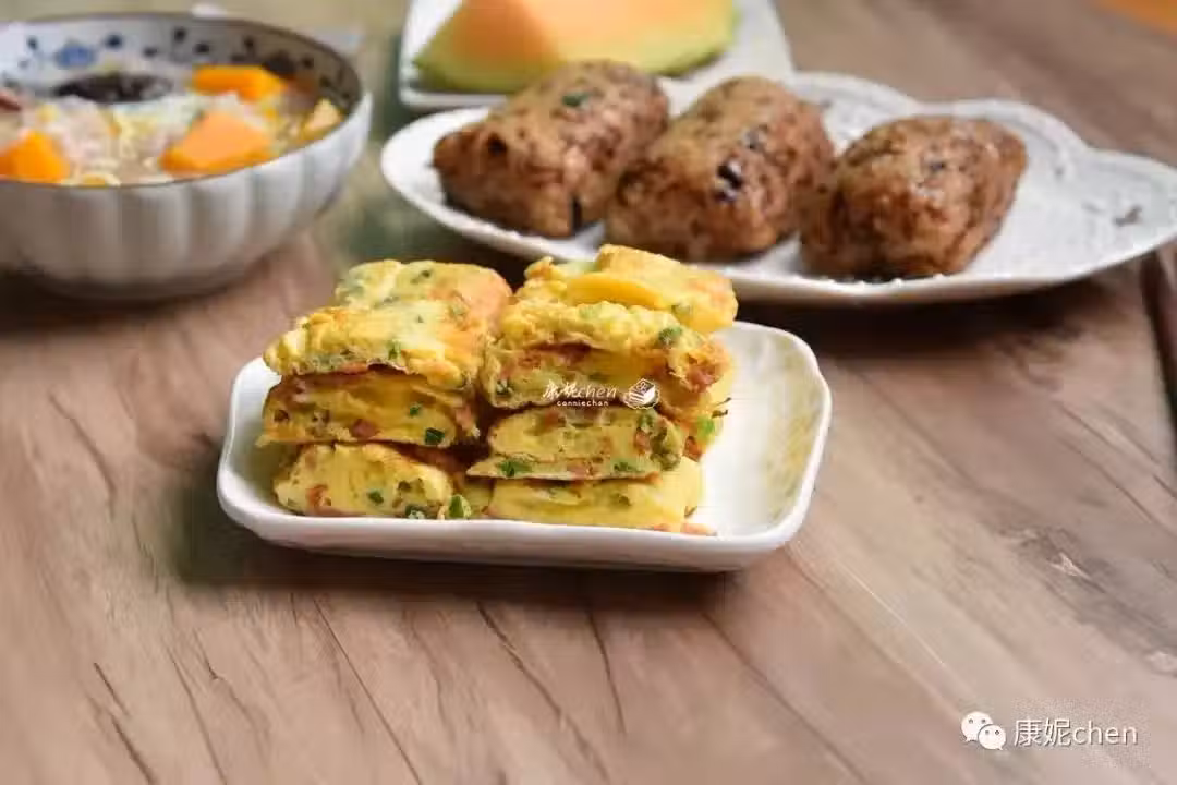 【厚蛋燒材料】雞蛋3隻,香蔥2根,火腿30克,鹽適量。