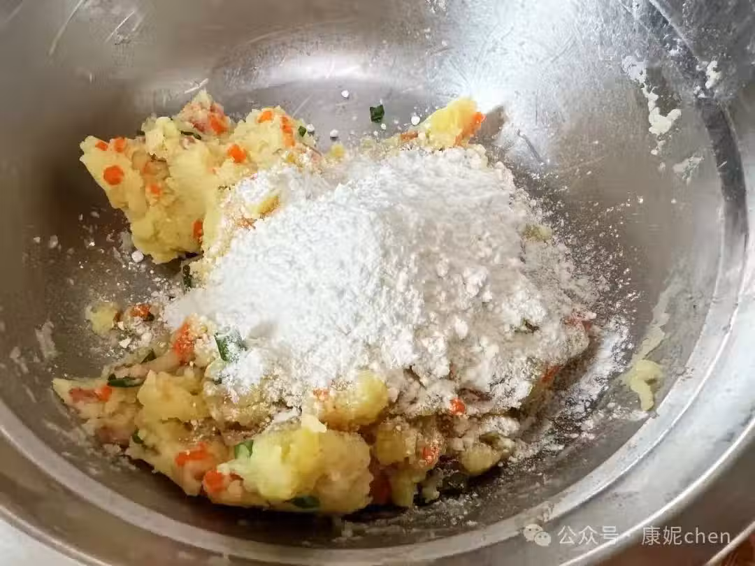 第六步:加入香蔥、鹽、胡椒粉和麵粉混合均勻,攪拌成軟硬適中的土豆餅麵糰。我個人覺得如果想土豆餅軟糯點,麵粉可以少放。我分了兩次加入麵粉,看土豆麵糰的狀態加入麵粉,這裡所用麵粉就是普通的中筋麵粉,可以用低筋麵粉。