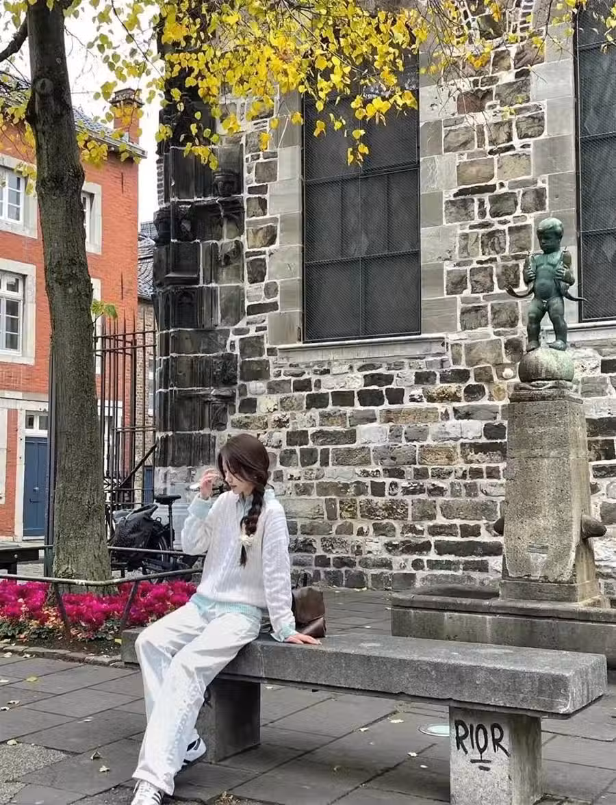 3、坐著拍全身照的時候,要想擁有大長腿,就可以將一條腿盡量向前伸直,攝影師蹲下來,將腳安排在畫面的底部,拍出來的照片就會擁有大長腿。