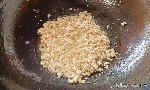 【步驟六】:肉末焯水,放入蔥姜蒜和豆瓣醬,小火把調料炒香,放入一勺白酒,把白酒的酒氣炒出來。。。。。。。。。