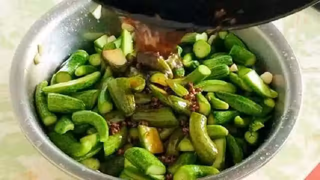 第四步:將放涼後的花椒八角水倒進裝有食材的盆里,料水的量不需要沒過黃瓜,後續在腌制的過程當中黃瓜還會出水的。蓋上蓋子放入冰箱冷藏一夜後即可食用,吃多少取多少就可以,記得取的時候一定要用無油無水的勺子或者筷子盛出來,這樣剩下的不容易壞。
