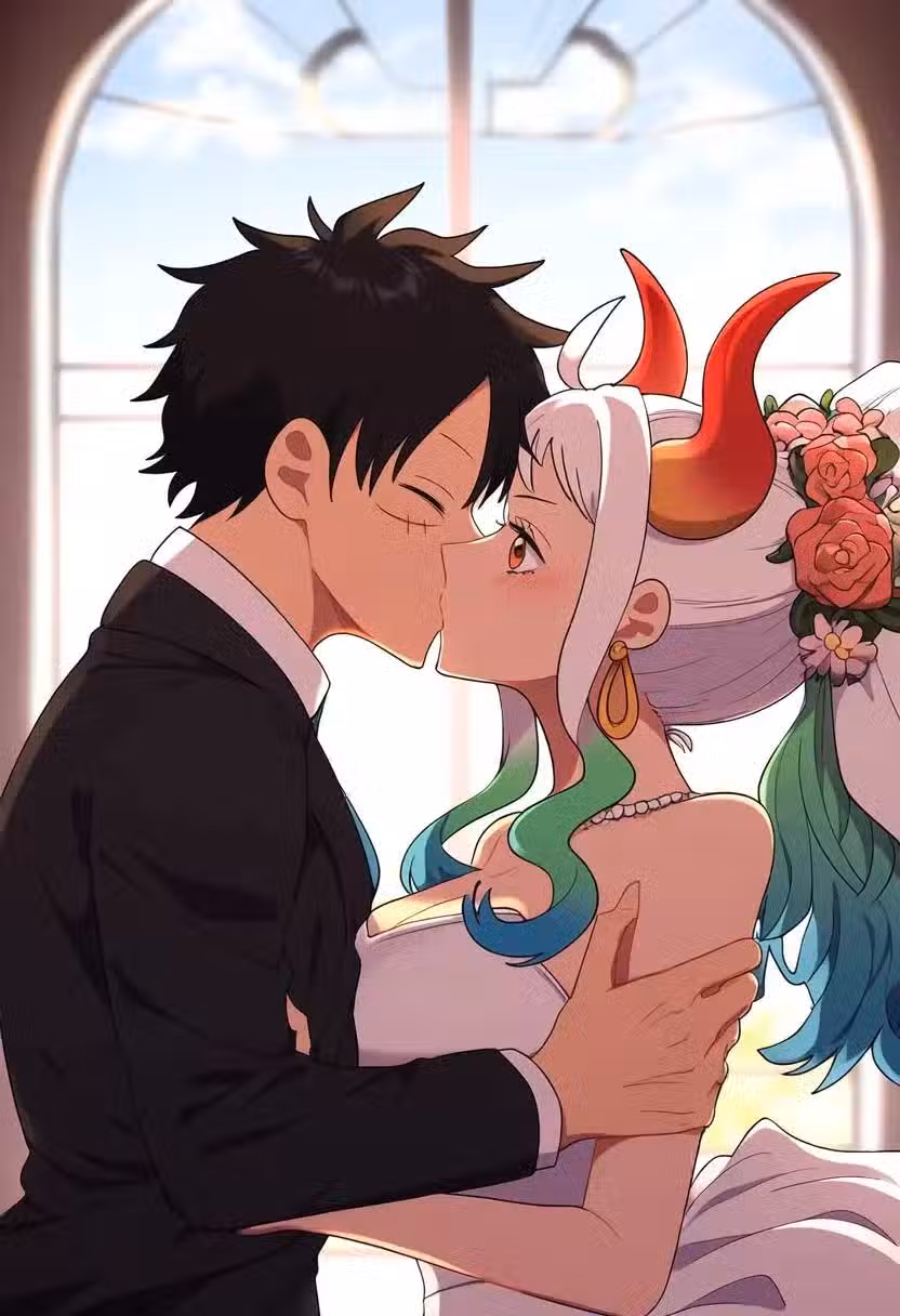 大和和路飛站在華麗的禮堂中心,眾人環繞。他們眼神交纏,情感如潮水般湧動。無聲的誓言在空氣中彼此交融,隨著深情的吻,他們的愛情在眾目睽睽之下達到巔峰。