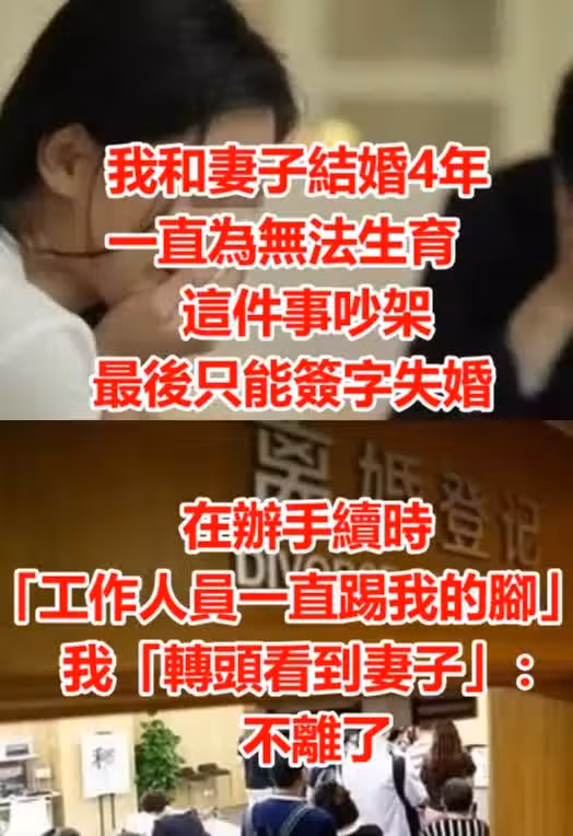 我和妻子結婚4年,一直為無法生育這件事吵架,最後只能簽字失婚。在辦手續時「工作人員一直踢我的腳」,我「轉頭看到妻子」:不離了~