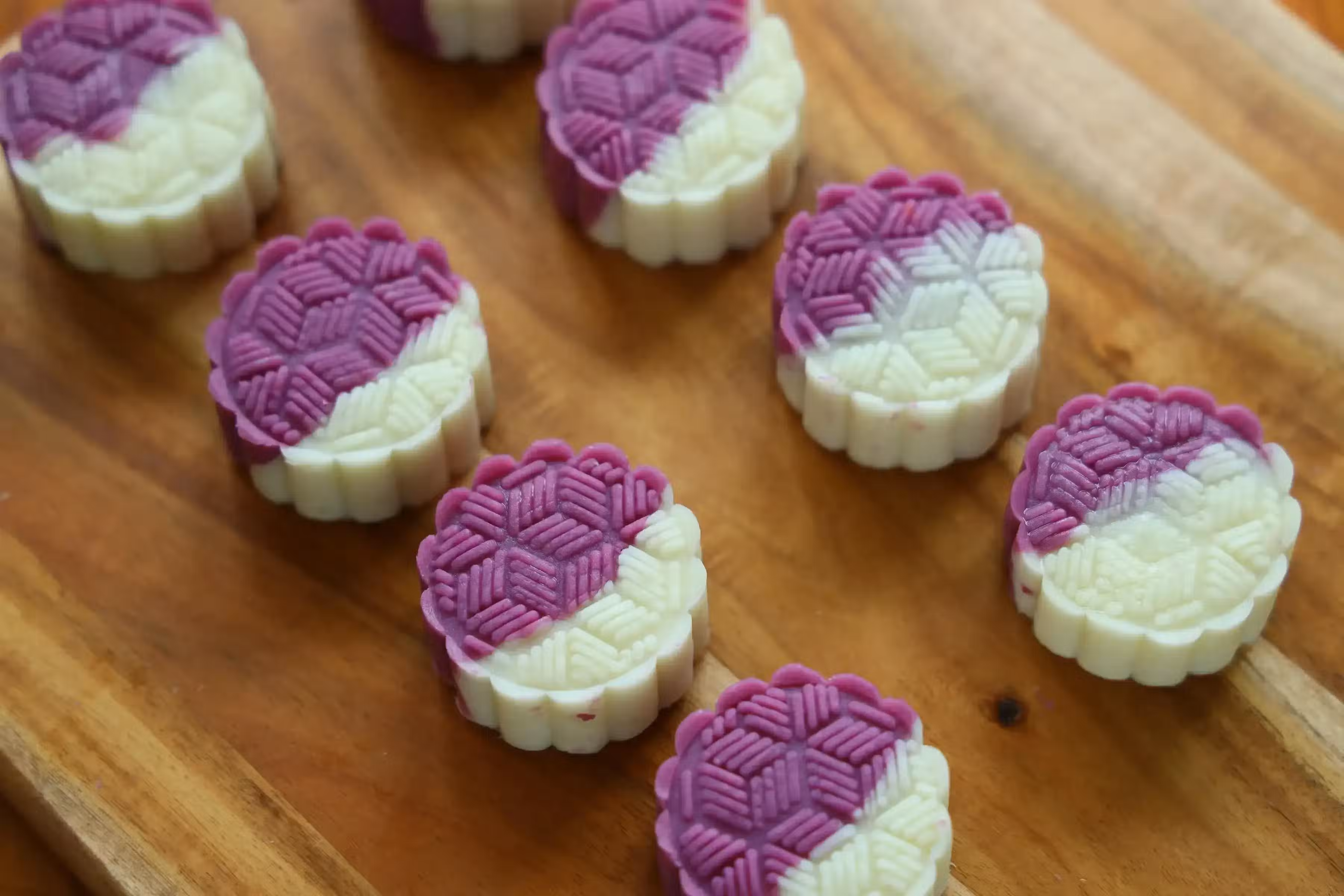 在製作過程中,我們巧妙地分出一部分山藥泥,加入了紫薯粉,於是,我們就得到了兩個顏色的麵糰:一個潔白如雪,一個淡雅如紫。這兩個顏色的麵糰,就像是一對戀人,相互依偎,相互映襯,美得讓人心動。
