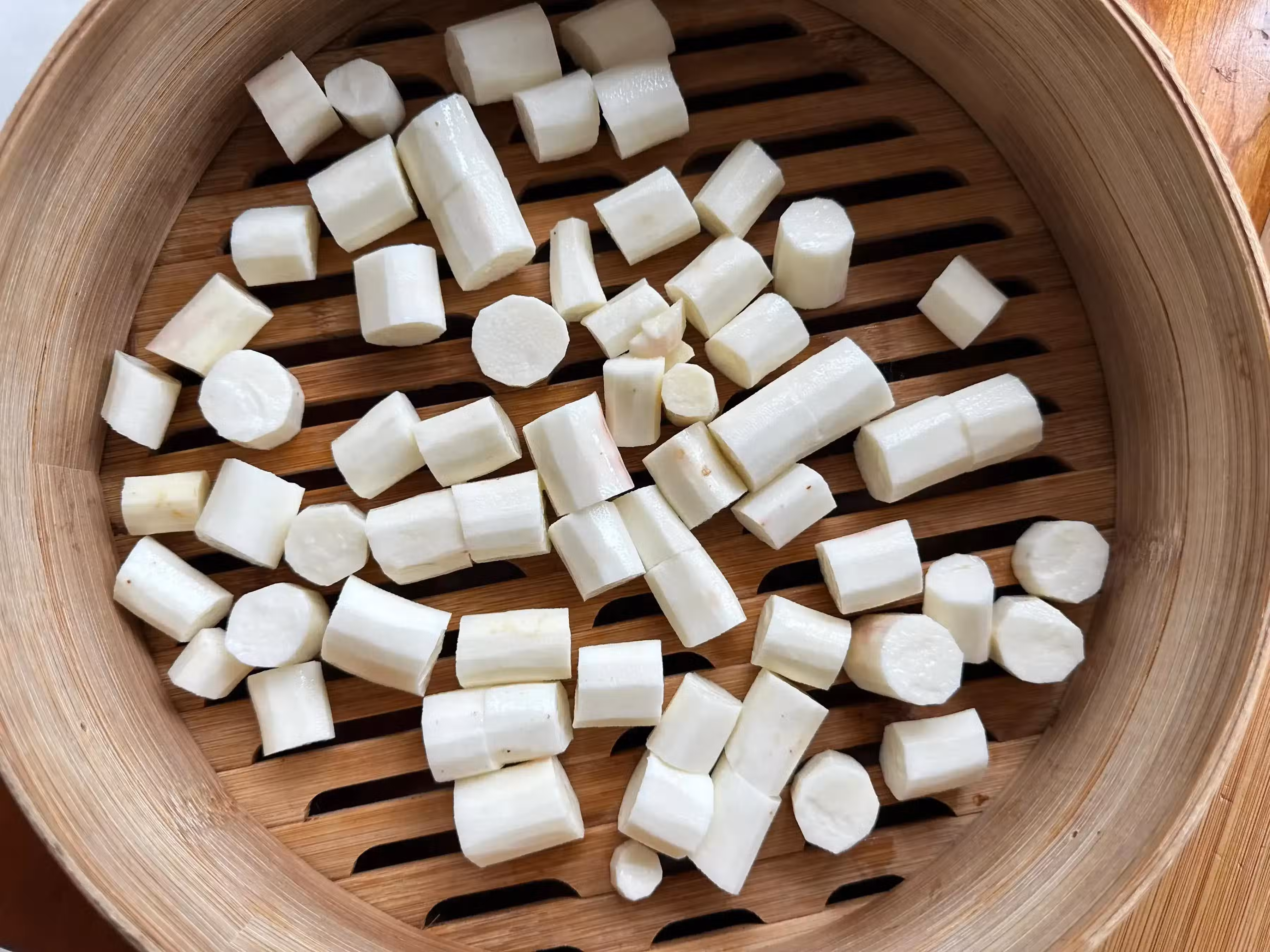 3、蒸熟之後倒出來壓碎;喜歡吃甜的可以在這一步加入白糖。