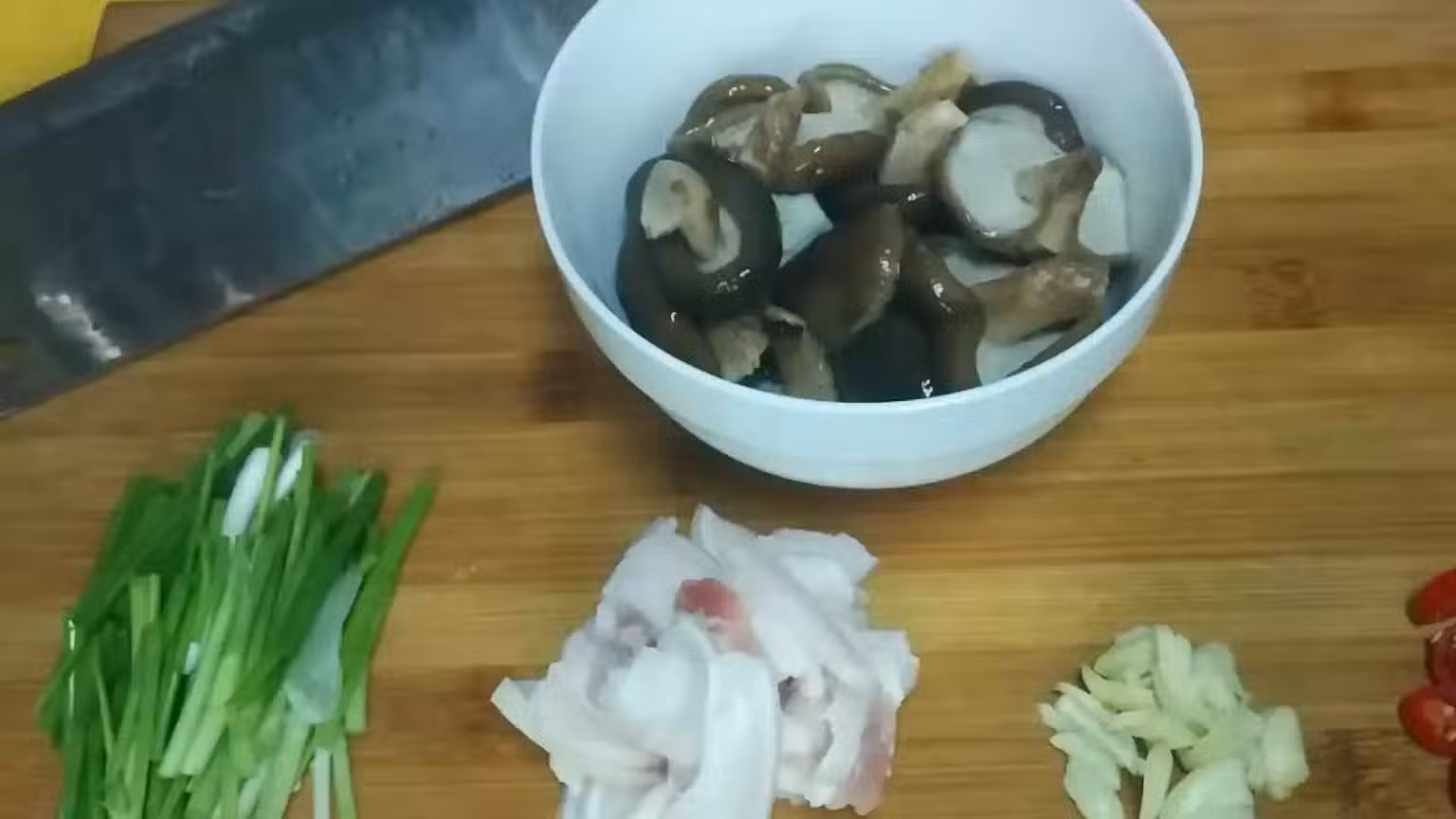 1、首先,食材洗凈;將香菇去根,提前用開水煮熟,放入碗中備用;五花肉切均勻小片,蒜子輕輕拍碎,紅辣椒切成辣椒圈,香蔥切成3-4厘米左右的蔥段。
