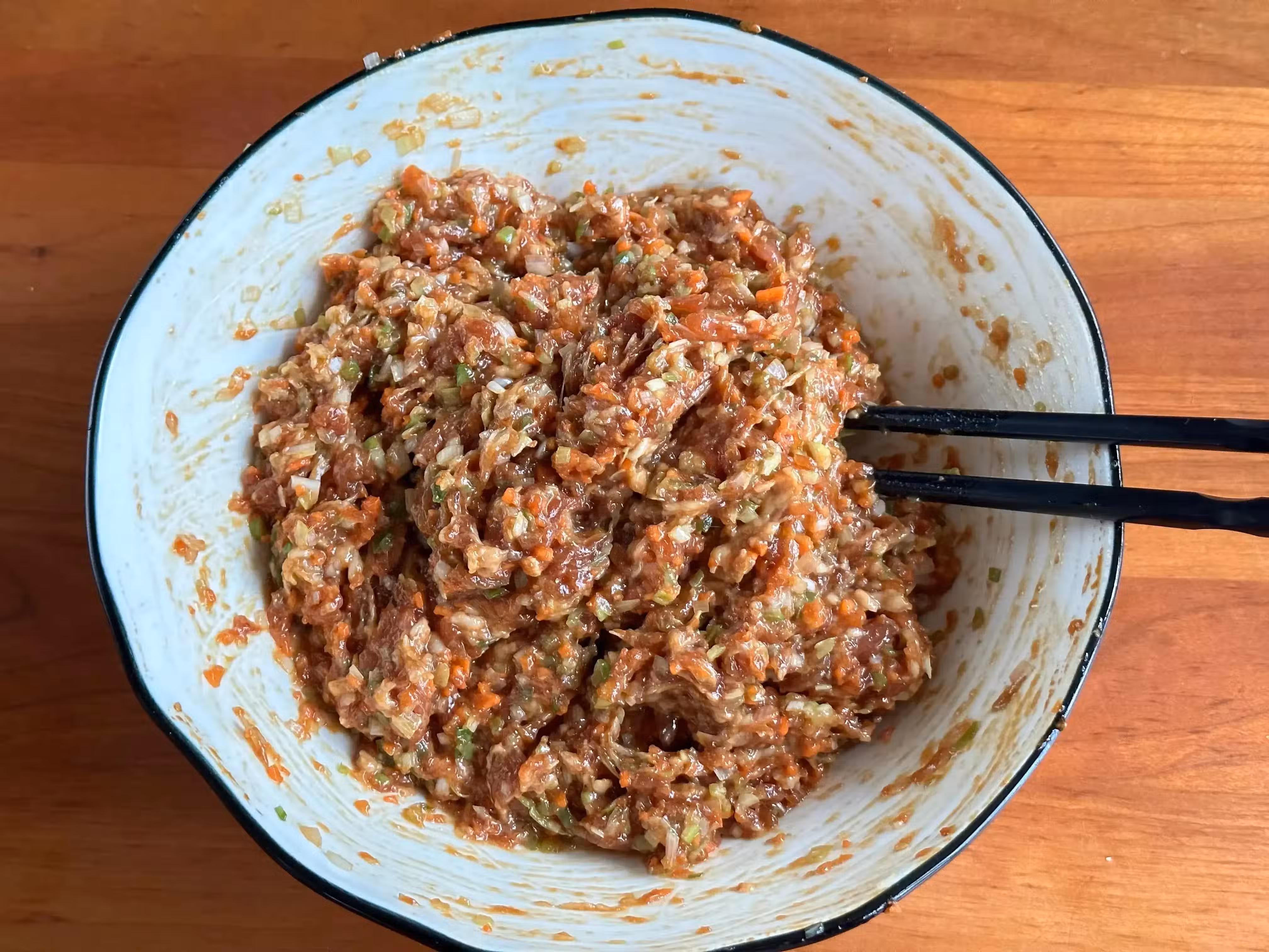7、最後肉餡兒提起來掛在筷子上不會輕易掉落,這個餡兒就完成了。