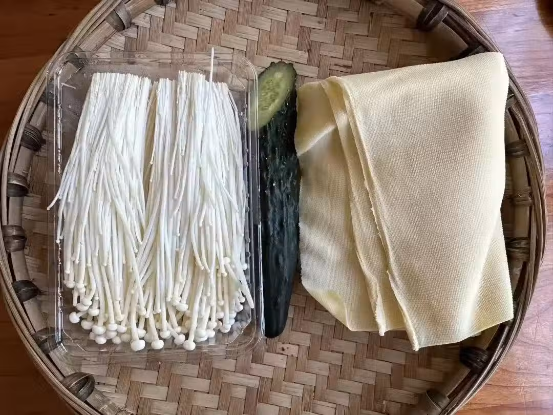 2、豆腐皮切絲,跟金針菇一起焯水;撈出來瀝干水分備用;金針菇不要焯水時間太長了,煮開後撈出來。