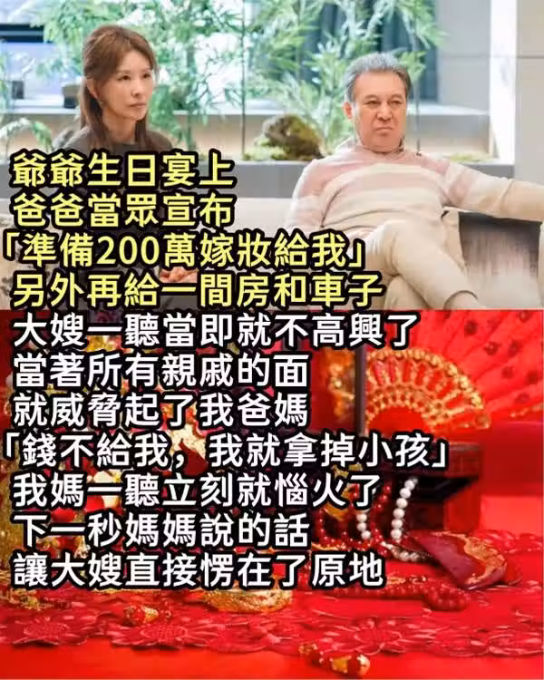爺爺生日宴上,爸爸當眾宣布「準備200萬嫁妝給我」另外再給一間房和車子,大嫂一聽當即就不高興了,當著所有親戚的面就威脅起了我爸媽,「錢不給我,我就拿掉小孩」 我媽一聽立刻就惱火了,下一秒媽媽說的話讓大嫂直接愣在了原地