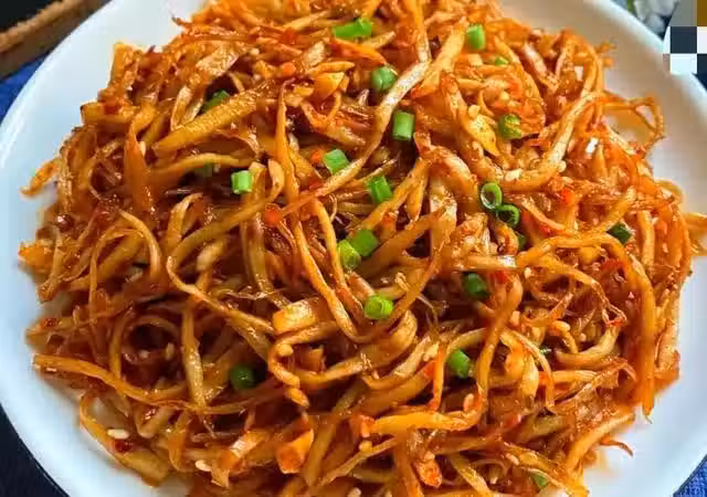 (3)爆香:鍋中熱油爆香小蔥蒜末,倒入杏鮑菇小火翻炒至金黃色。