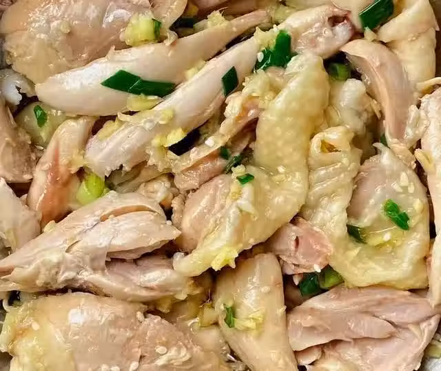 2、撈出過涼水,洗乾淨後,放入涼水浸泡涼透。放入大碗,手撕去骨,撒上白芝麻。