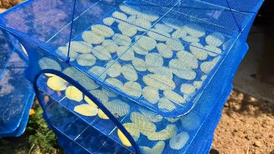 土豆片在太陽的暴曬下,顏色慢慢變黃變薄,還散發著淡淡的土豆清香,夏天最適合曬乾菜了,在我們農村,地里的菜長得特別快,吃得速度永遠趕不上生長的速度,為了不浪費就會曬成乾菜,這樣容易保存味道也好,像茄子干,苦瓜干,豆角干,黃瓜干,馬齒莧乾等等,一次多曬些,冬天不愁沒好菜吃了。